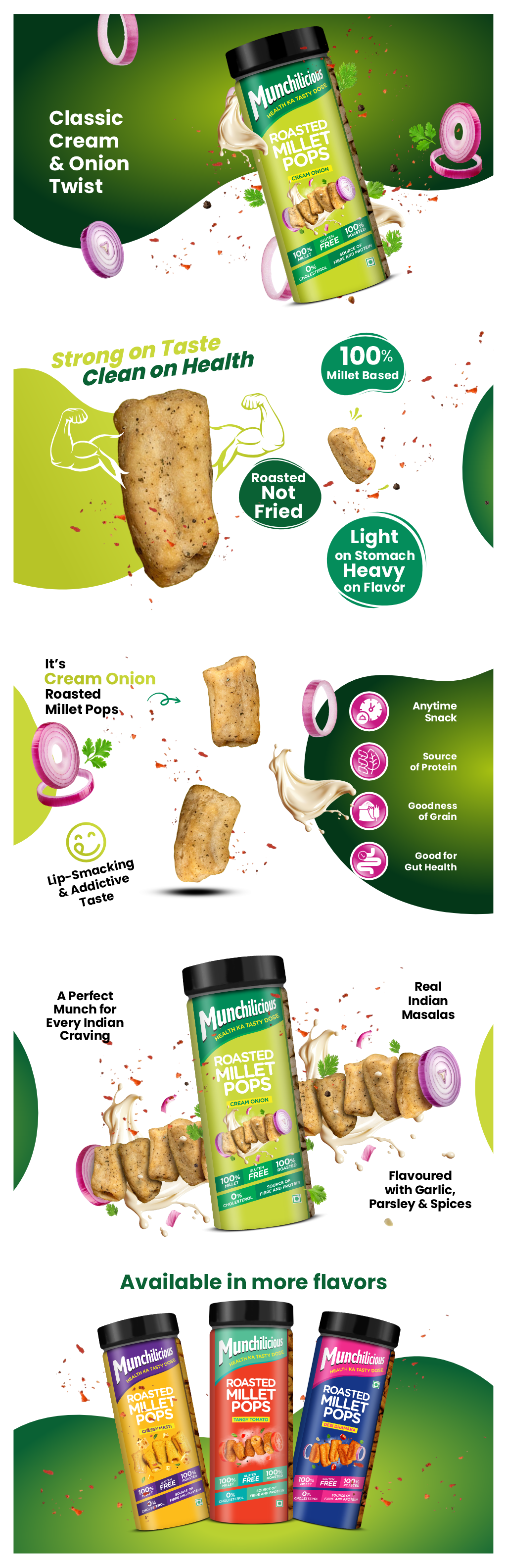 Smooth cream and sharp onion seasoning coat crunchy millet puffs for a savoury delight. Perfect for tea-time, movie nights, or sharing with friends.